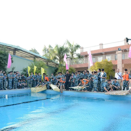 第三个项目是人造纸船,造好的船由一个重量120斤的学员坐上船划过游泳池。大家集思广益,你一言,我一语,充分发辉每个人的想象力和创造力。造出来的船款式多样,各有特色。比赛开始后,有的一路顺畅,安全划到终点,有的在水中划行一段后,纸进水被打湿,队员被泡在水里。人在船在,在大家的加油声中,学员拖着纸船,努力游向终点。相信经过这次失败,如果再造船的话都会成功。这个游戏告诉我们,要发扬团队开拓精神,勇于创新,敢于尝试。就算是失败,我们也可以从中收获很多经验和不足,为以后的成功奠定基础。
